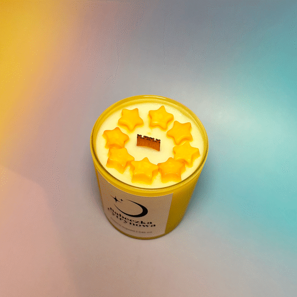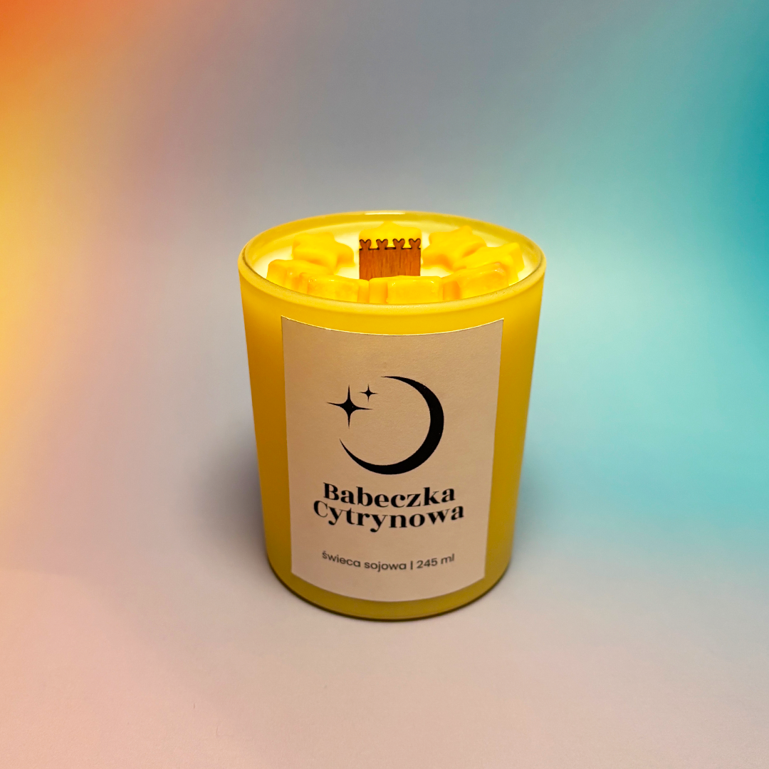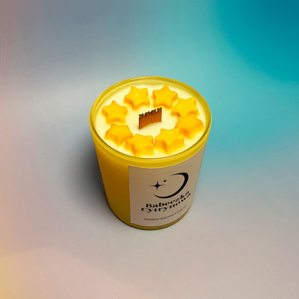 Ręcznie robiona świeca sojowa o zapachu Babeczki Cytrynowej – soczysta cytryna w połączeniu ze słodką wanilią, która otula przyjemnym, radosnym aromatem. Na wierzchu gwiazdki w kolorze żółtym, które dodają świecy uroku, a mika w wosku pięknie mieni się podczas palenia. Drewniany knot zakończony serduszkami tworzy uroczy akcent.