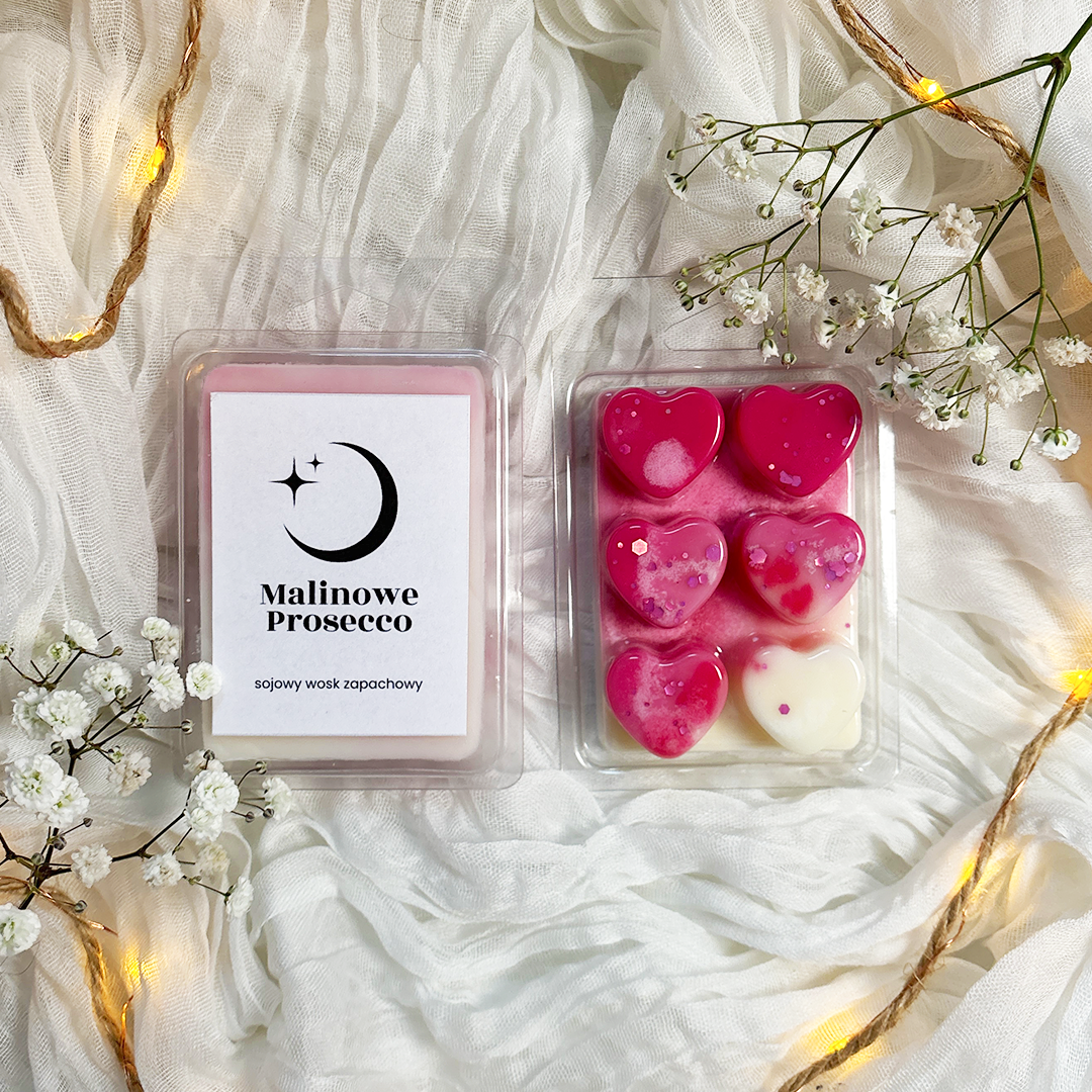 Słodki, otulający wosk zapachowy o aromacie malinowego Prosecco. Idealny do stworzenia ciepłej, przytulnej atmosfery w domu.