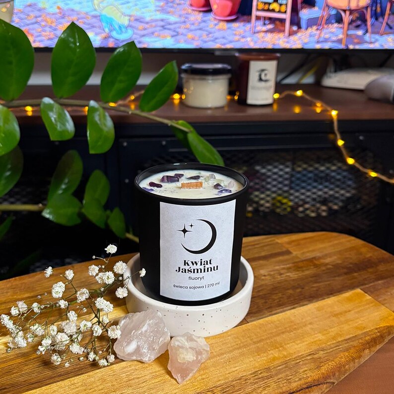 Ta świeca to połączenie zapachu, koloru i energii fluorytu — świetny prezent dla kogoś, kto ceni naturę i spokojną aurę w domu.