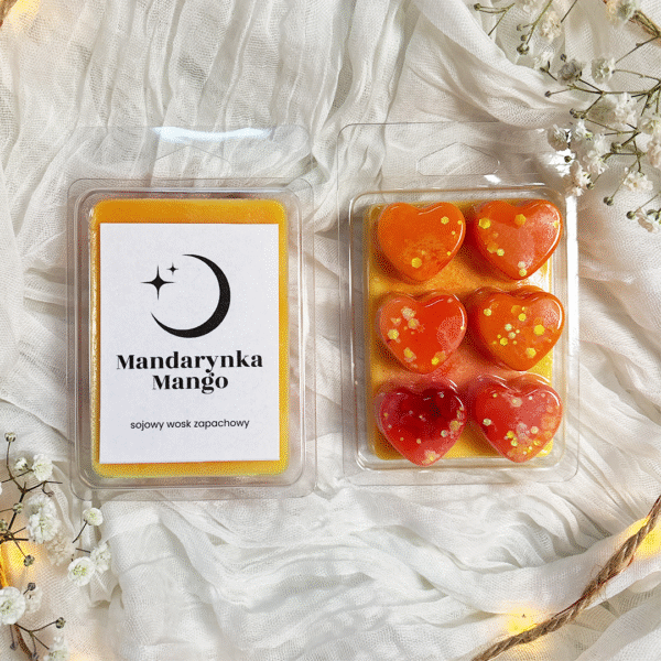 Wosk zapachowy o aromacie mandarynki i dojrzałego mango – słodko-owocowy, soczysty i pełen wakacyjnej energii.